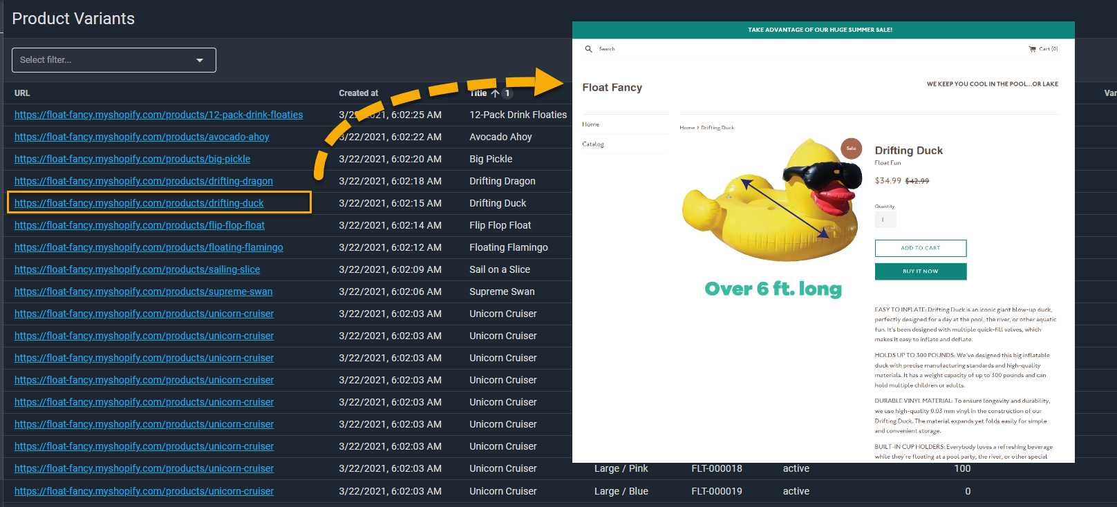 Using this column, you can directly link to where the product is published on your Shopify site - making it easy to switch between looking at the product details and the actual product as it has been published.