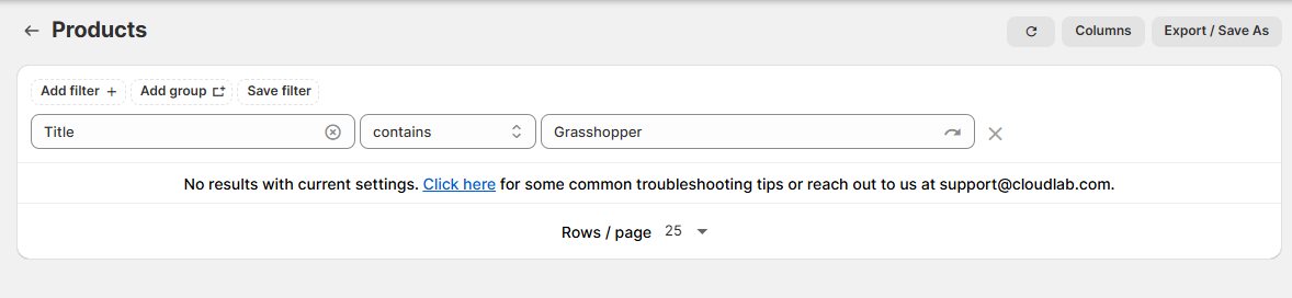 Then of course I get no results - as there are no products with Grasshopper in the title.