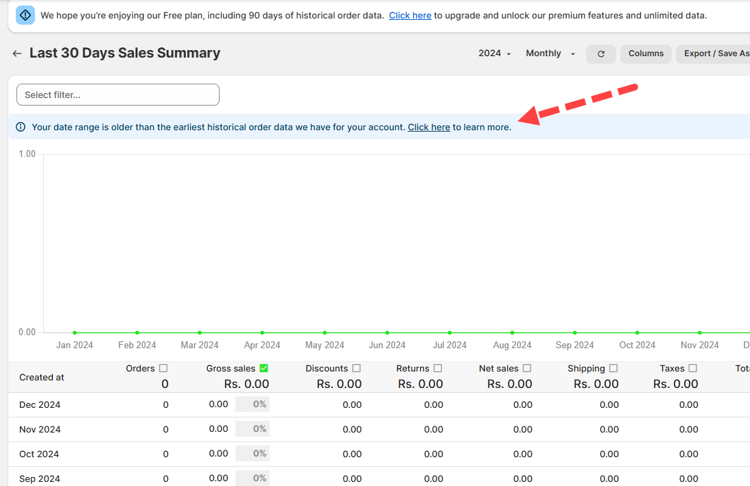 So if you set your report to say, 2024, and you are a Free Plan user, then you would see no results in the report: