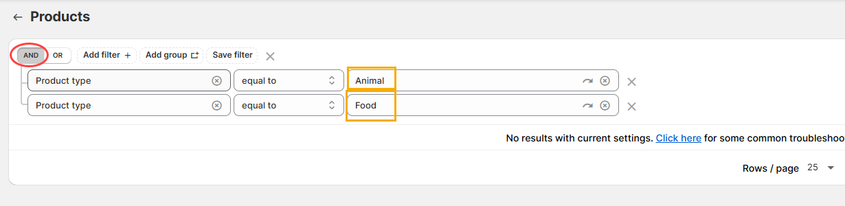 No product can have more than one Product Type in Shopify, so it isn't possible for something to be both an Animal and a Food Product type. In this case, I should switch to OR.